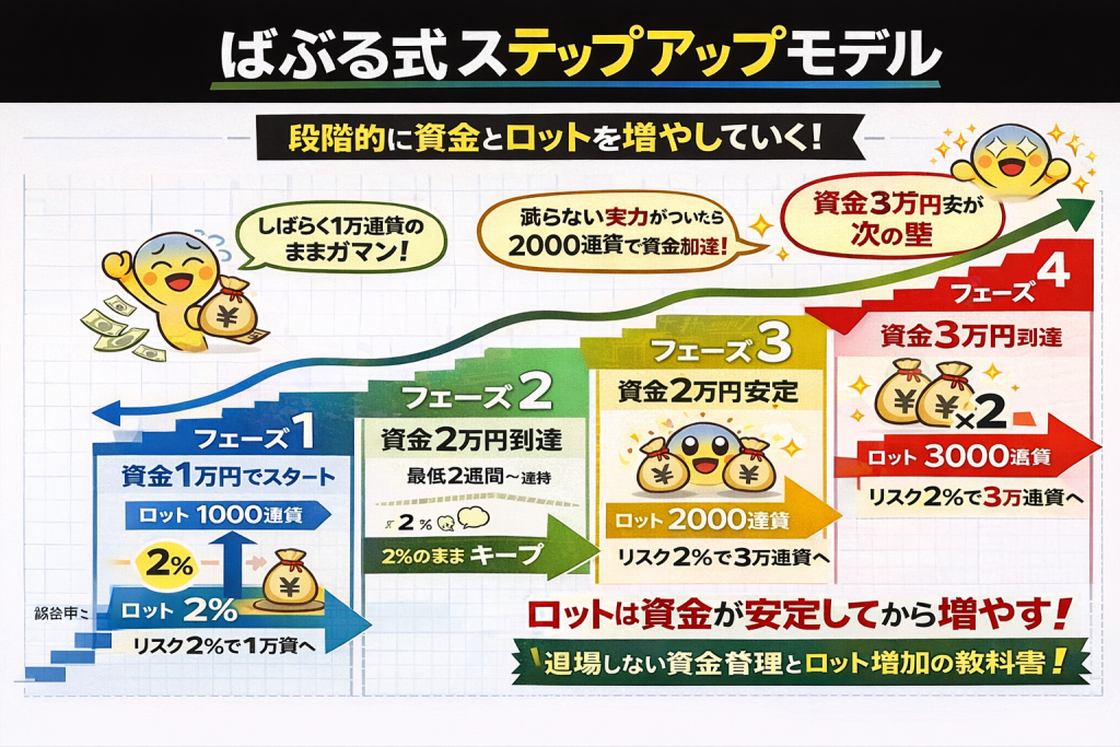 という条件で、1万円運用でも資金が増えていく構造を確認しました。