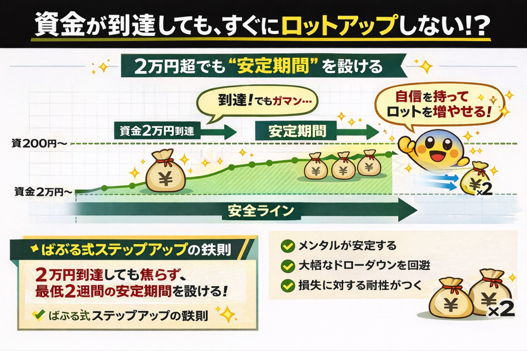 資金が条件を満たしても、すぐにロットを上げません。